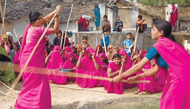 只要有受到压迫的妇女请求帮助,“粉红帮”的成员就会迅速穿上纱丽,拿起她们统一配备的武器(一根长为1.5米的木棍)出发。
