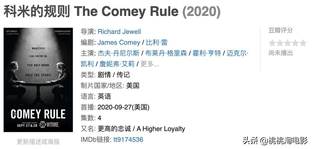 这个迷你剧根据前美国联邦调查局局长james comey撰写的同名书籍改编。杰夫·丹尼尔斯饰演comey,布莱丹·格里森饰演特朗普。