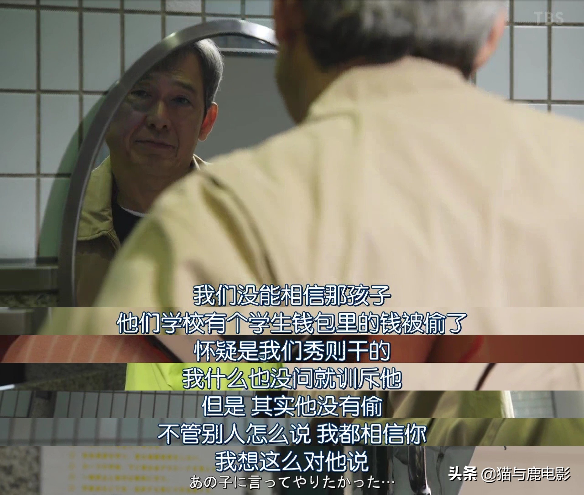 在卫生间,大叔对着镜子哭着说,因为儿子叛逆期,同学丢了钱怀疑是他偷的,作为父母没有选择相信他,导致了他自杀。