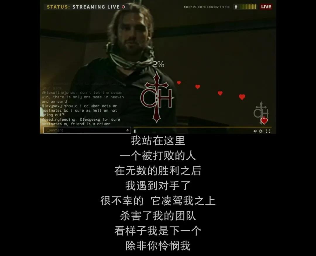 播过程中,神父还有一种类似于真人秀的语语:我的粉丝们,我站在这里,一个被打败的人,在无数的胜利之后,我遇到对手了…很不幸,它凌驾我之上,看样子我是下一个被恶魔吞噬的人,除非你怜悯我…