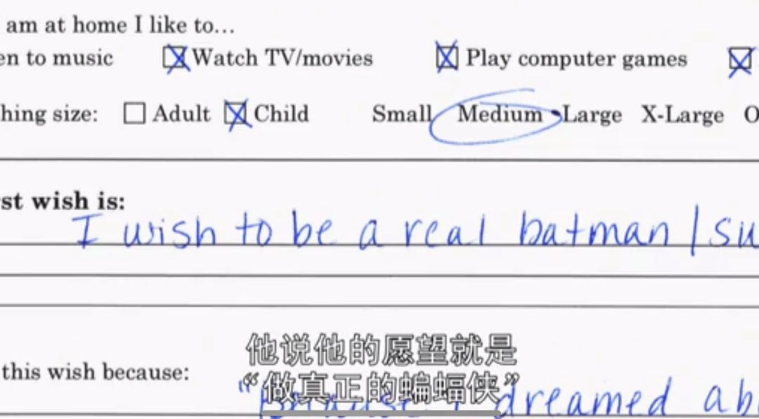 我也想把病魔打败,然后就可以变成蝙蝠侠,去帮助别人。”