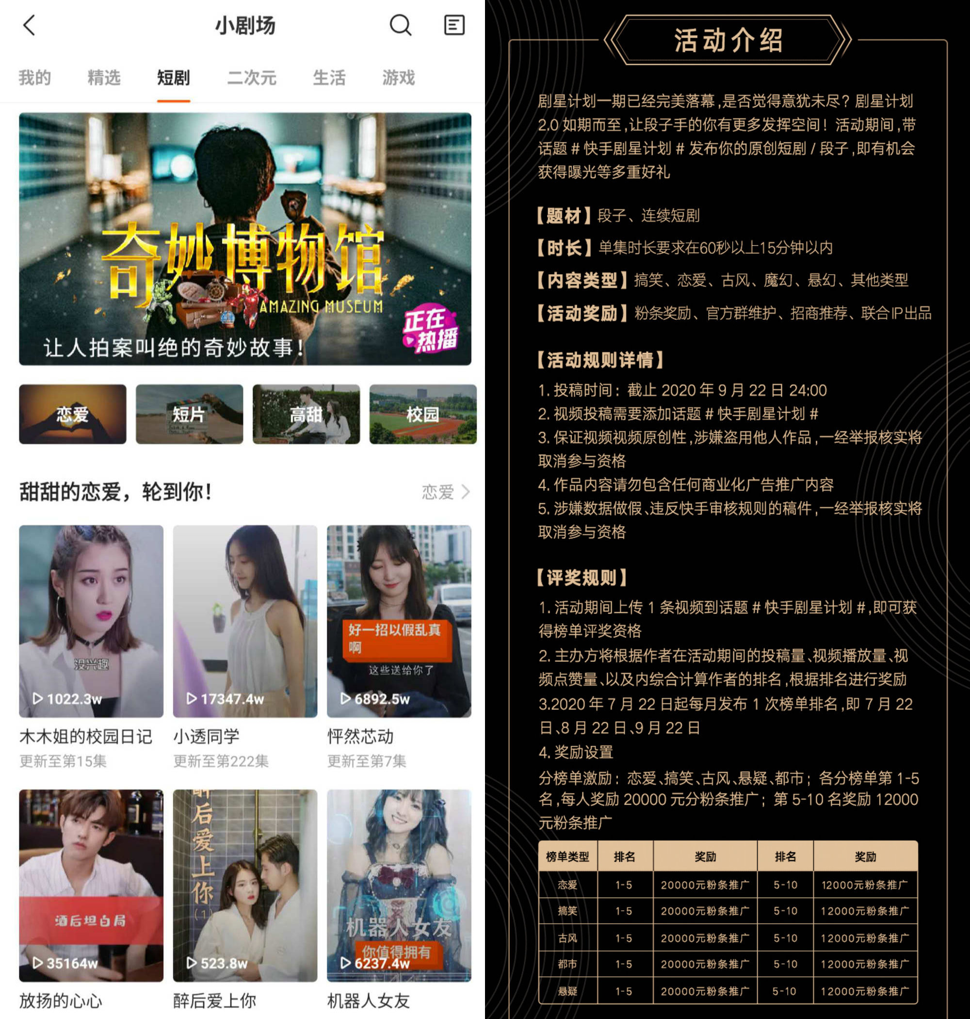 快手不仅专门开辟了“小剧场”板块,还推出了“快手剧星计划”活动。前不久还有媒体报道显示,快手将投入超百亿流量推广优质短剧。