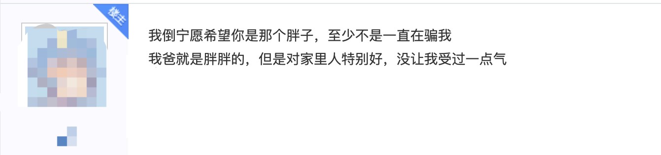 惊喜?妹子没有。但是却有很多的伤心。她不介意情缘有多胖,只希望两个人能坦诚相对,没有任何欺骗。可只是体型一项,情缘就欺骗了她一年半的时间,那么他之前说的话,有几句是真的,有几句是假的呢?
