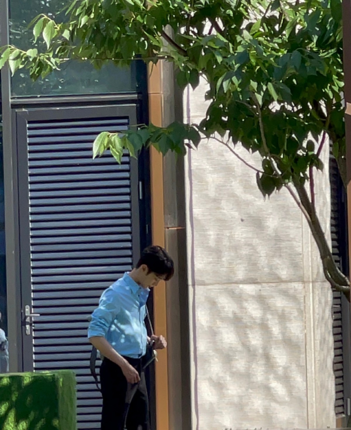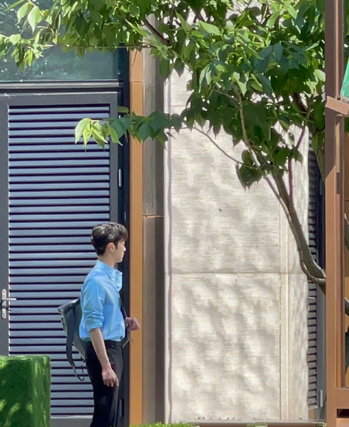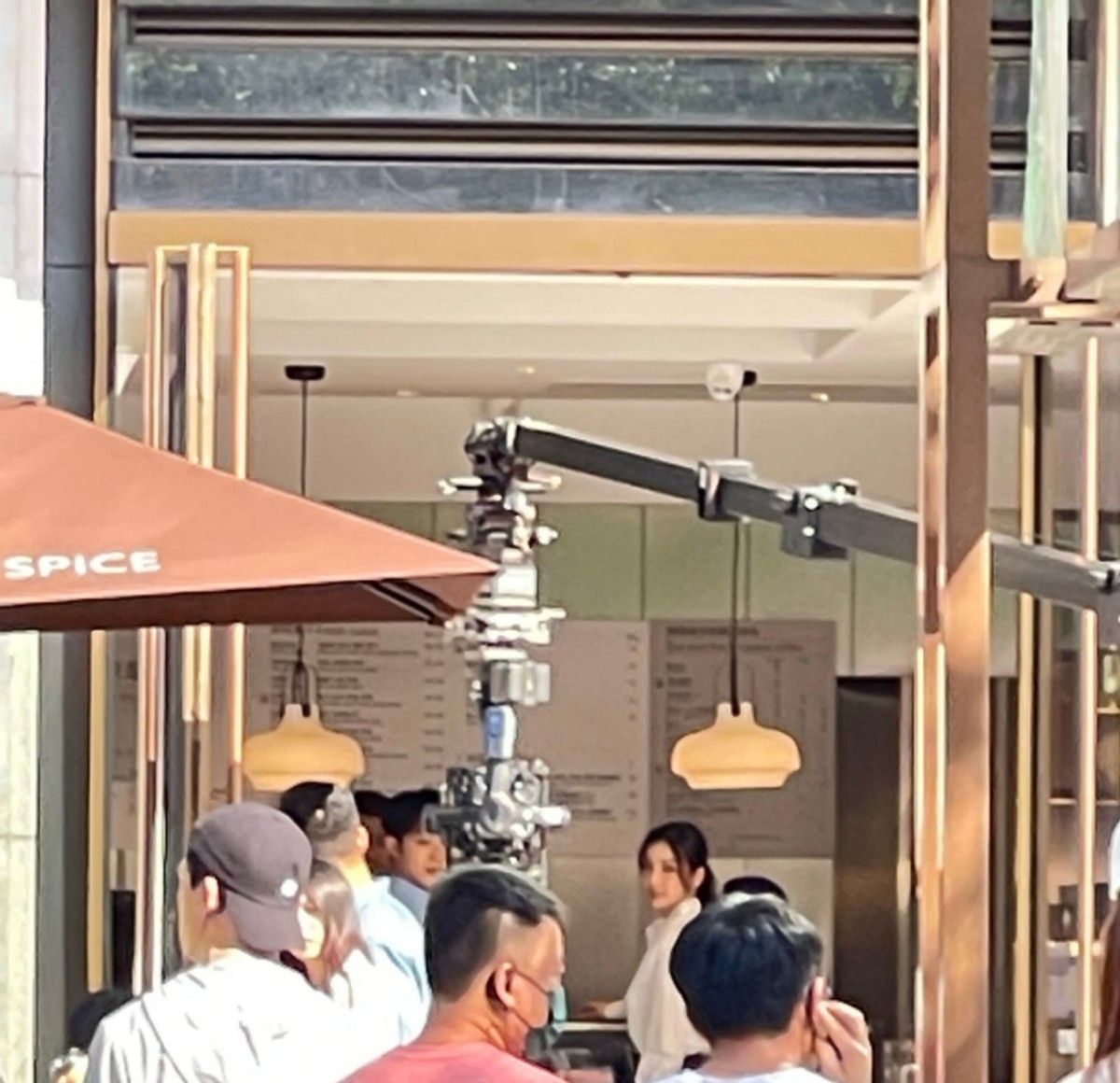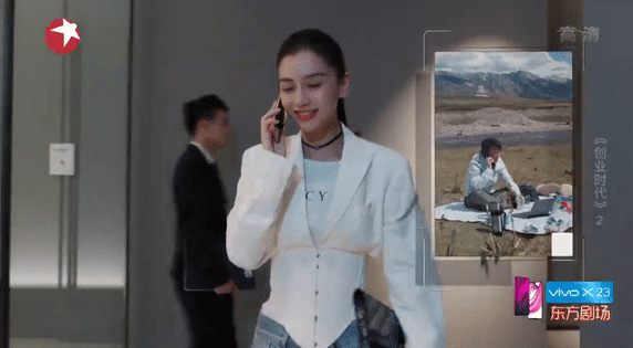 现在的天气还是比较热的,杨颖大波浪卷发搭配短裙非常清凉,好像是在拍店铺里购买东西的戏份。赖冠霖身穿蓝色衬衣手拿公文包,看样子是上班族的造型。