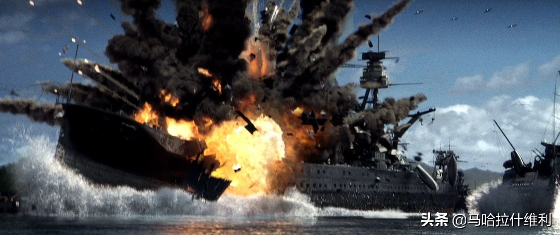 在部分爆炸场面中,剪辑能够尽可能地将“战场残渣飞溅贴镜”的画面删去,以减少镜头感的出现,防止幻觉的打破和丢失。和以前的影片不同,2001 年拍摄的《珍珠港》采取了数次第三人称的跟随视角,在“航弹落入亚利桑那号”、“九九舰爆俯冲轰炸”、“九七舰攻掠海投雷”等场面,摄影镜头的稳定跟随给影片增添了不少光彩。此类镜头在《决战中途岛》中的运用次数则大幅增长,但《决战中途岛》的硬伤还是把它脱下了水,关于这本电影的内容,我会放在以后细说。