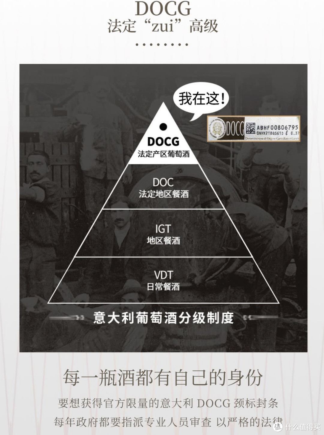 docg是意大利红酒等级,一般代表意大利品质最高的葡萄酒(denominazione di origine controllata e garantita)。作为优质法定产区级葡萄酒,有着最严格的生产、评选和质量控制规定。每一瓶docg级别的葡萄酒都配有国家标识,即标注有docg字样的粉色封条,且经过两次质量检测。而想要升级为docg级产区,则需要首先升入doc级别,并至少维持五年。目前,意大利共有74个docg级产区。