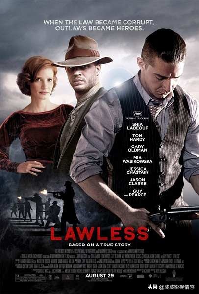 7.《无法无天》美国,2012年。约翰·希尔寇特导演,希亚·拉博夫、汤姆·哈迪、加里·奥德曼、米娅·华希科沃斯卡、杰西卡·查斯坦、杰森·克拉克、盖·皮尔斯主演。