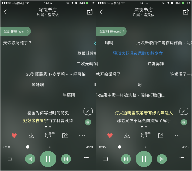 这首《深夜书店》在酷狗音乐上线不到两天时间,弹幕和评论区就是满满的999+,看来网友们对这种欲言又止的大叔萝莉组合有很多话要说。"