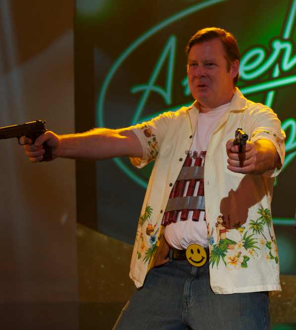 萝莉飒爽英姿 绝对的“大叔+萝莉”的杀手组合 frank身缠“炸药”袭击美国超新星现场 “萝莉”看着frank,再次选择了自己的人生立场而最后,屌丝叔拿着ak47前往美国超级明星《上帝保佑美国》总决赛现场,与大龄萝莉一番扫射,将影片中最后也令人厌恶的对象——选秀评委,胖子歌手。毒舌观众都打死。感觉frank扣动扳机之前,他绝望了。对这个社会,对自由,对美国,发自内心的深深绝望。于是子弹横飞血溅当场,一老一少双双倒地。这是老好人frank对这个社会以及自身的最后裁决。然后黑屏,god bless america字样出现……伴随着按耐不住的激动,影片划上了这部黑色幽默的句点。