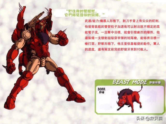 剃刀(razorbeast):白狮王小队核心成员之一,野兽形态是野猪,脾气非常的暴躁,战斗的时候百折不挠,坚定不移,无所畏惧,战斗素养极高,而在生活中哪怕是朋友惹怒他,他也会毫不留情的撞过去,是一个非常聪明的莽夫。
