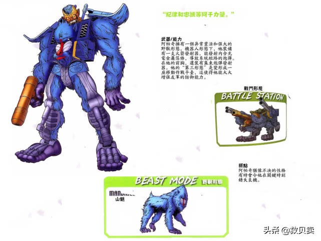 阿帕奇(apache):小队副指挥官,白狮王的可靠助手,忠于伙伴,遇事冷静,谦虚,勇敢,巨无霸中的典范人物,拥有三种变身形态,他的“第三形态”可以变成移动碉堡,极大的增强队友的防御能力,野兽形态是一只蓝色的山魈,之前小编还以为野兽形态是犀牛之类的。