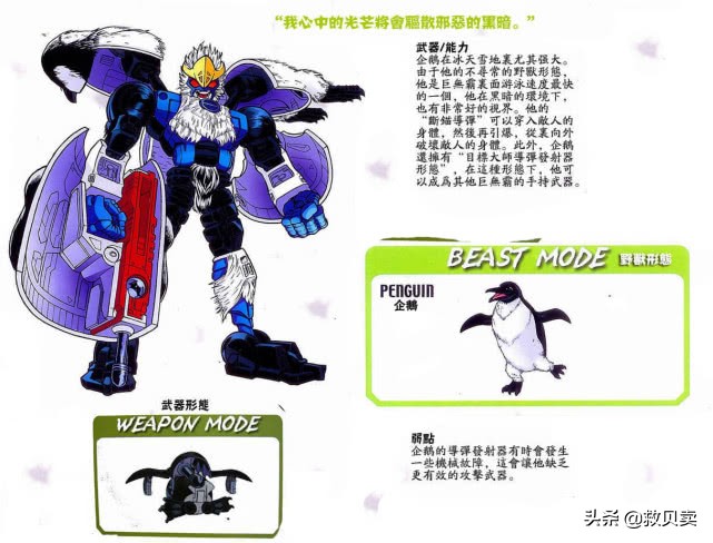 企鹅(break):队伍中的小家伙,总是充满热情地去执行任务,想以此来证明自己的价值,野兽形态是一只憨憨的企鹅,非常适合雪地作战,在黑夜的环境下也有非常好的视野,并且还能变身为“导弹发射器”,成为其他伙伴手中的武器。