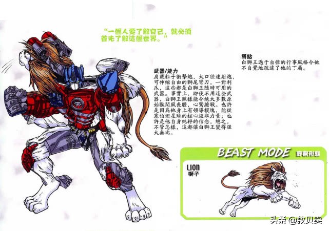 白狮王(lio convoy):小队指挥官,野兽形态是一只白狮,机械形态从外表来看其实和擎天柱差不多,巨无霸首席指挥官,精神境界极高,极具领袖魅力(身上有领导模块),无论走到哪,都能与本地生物打成一片,其强大的力量令无数原始兽闻风丧胆,心惊胆战。