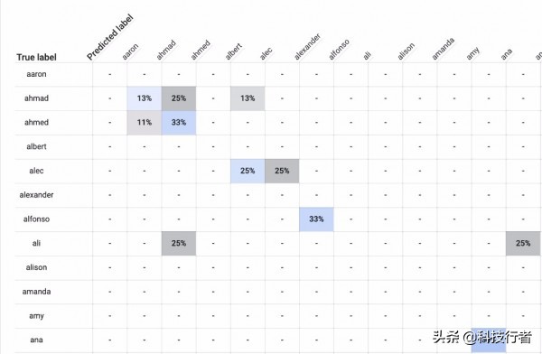 例如,在标有“ahmad”的行中,我们看到一个淡蓝色的框,标有“13%”。这意味着我们的数据集中,所有名为ahmad的条目中,有13%的比例被我们的模型正确标记为“ahmad”。这时向右侧框看去,在真名为“ahmad”的所有条目中,有25%被错误标记成了“ahmed”。另外有13%的条目被错误标记为“alec”。