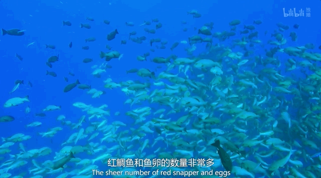 难以计数的红鲷鱼在产卵,而同等数量的黑鲷鱼则立刻冲上来把卵吃掉。