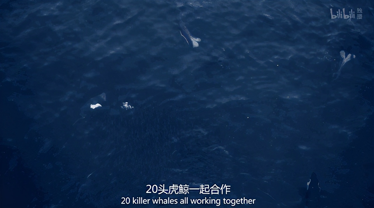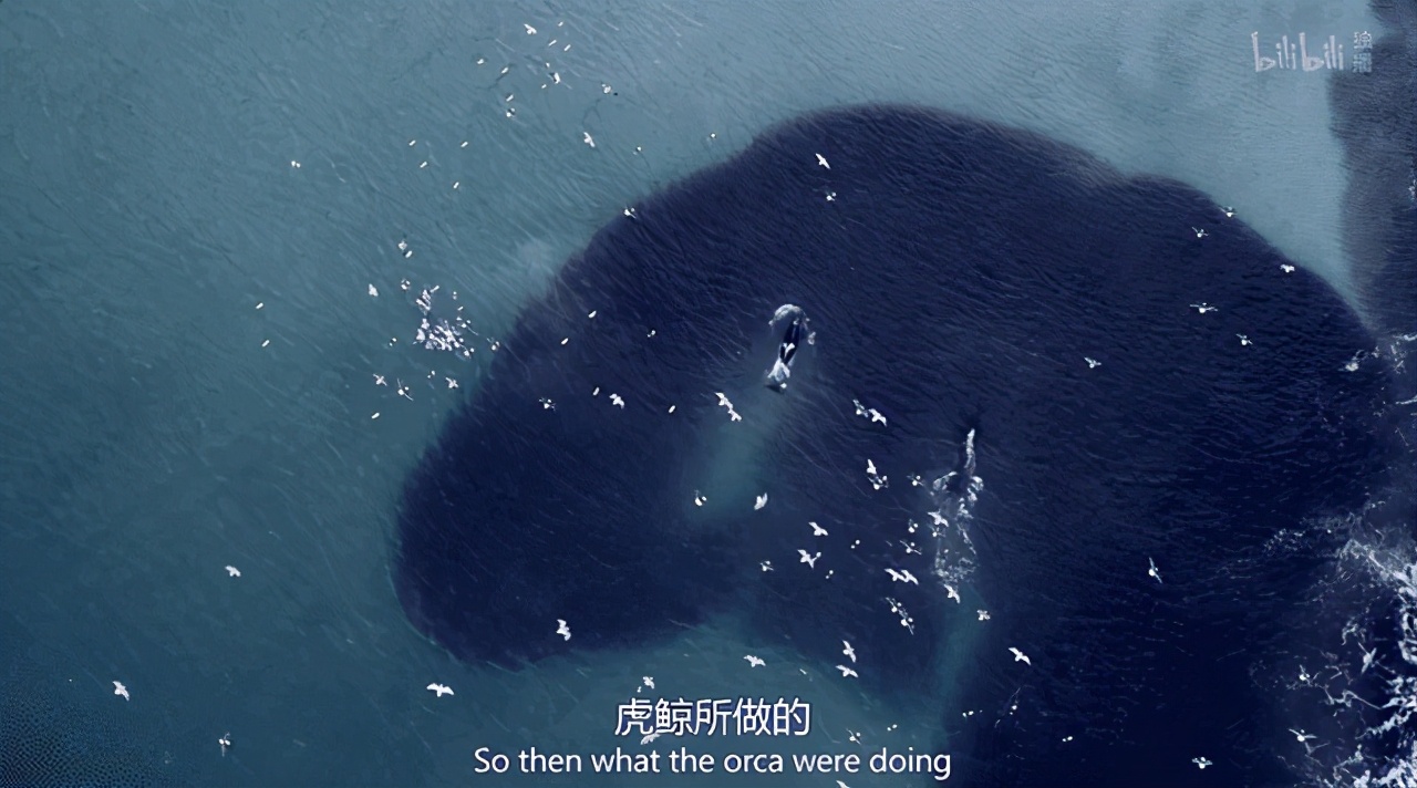虎鲸们通力合作,一起围堵、驱赶鲱鱼,分工明确,一只用尾巴拍晕它们,再让同伴来吃。