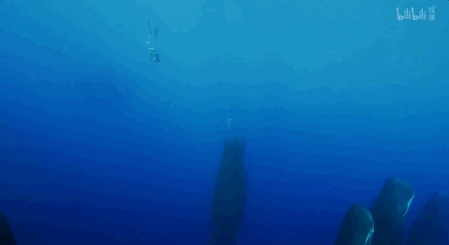 六头抹香鲸就竖直地悬浮在海面之下,如一个个外星生物的卵鞘矗立在那里,又像是在进行一种神秘的宗教仪式。