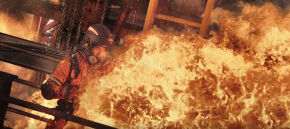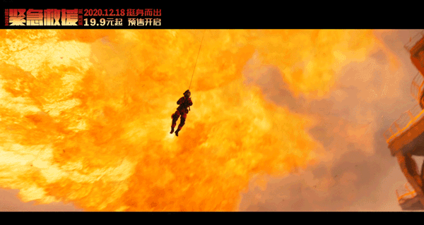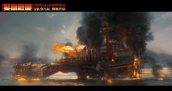 开篇第一场,海上钻井平台火海一片,爆炸声不绝于耳,浓烟滚滚之中钢铁搭建的钻井平台开始坍塌,此刻还有两个人未被救出……救援人员如天降神兵,从直升机上一跃而下、跳进火海之中救人!