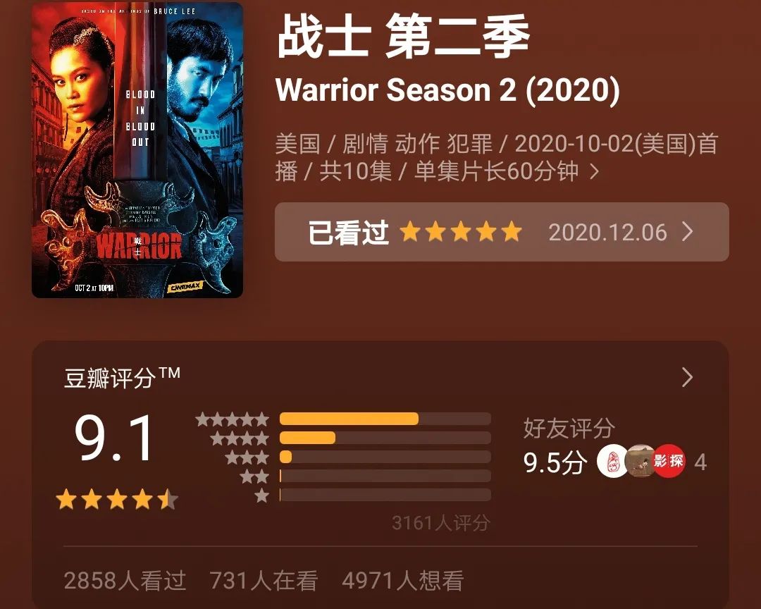 《战士》是部超精彩的剧,在当今这个时代,一部美剧能做到如此不偏颇,客观公正的看待华人移民历史,非常难能可贵,希望大家都去看看,去支持一下。