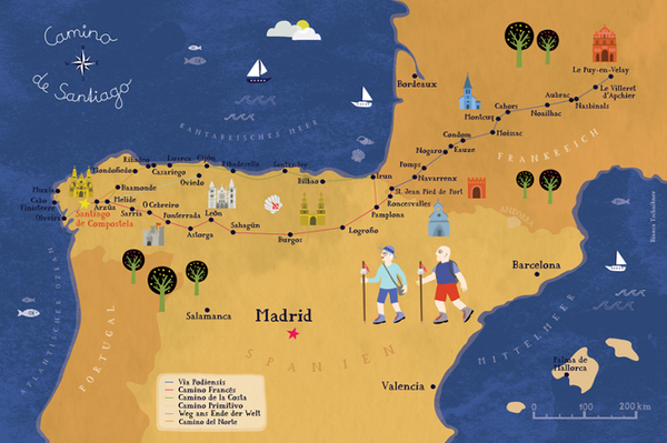 后来许多能通向西班牙圣地亚哥孔波斯特拉的路线都被称为“圣雅各之路”或“朝圣之路”。