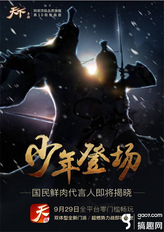 【代言人悬念海报登场,神秘身影终极大猜想】 《天下》手游代言人悬念海报今日登场!风雪飘摇的黑夜之中,似有两位太虚弟子,正鱼跃而起,长剑出鞘,寒气逼人。漫漫长夜,似要为远方投来的一束光所照亮。犀利冷峻的画面似乎预示着大荒世界要有大事发生。少年登场!《天下》手游国民鲜肉代言人即将揭晓!高颜值、正能量、潜力无限,90后小鲜肉即将实力演绎《天下》手游全新门派太虚!究竟神秘代言人是谁,他又如何亦正亦邪,少年意气,撩遍大荒!《天下》手游9月29日全平台零门槛畅玩,即将揭晓一切悬念!