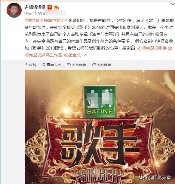 翻看被提名的歌手的微博,也有不少选手已经报名了。尹毓恪也微博发长文报名,表示自己完全符合条件。尹毓恪虽然只有二十岁,但却获得了2017年《快乐男声》全国总决赛季军,未来可期。