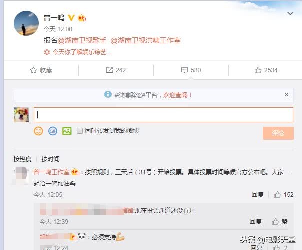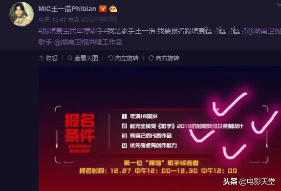歌手曾一鸣也选择了报名,只是简简单单的报名俩字,太酷了吧,粉丝们也等着投票呢。曾一鸣也是优秀的音乐人, 曾获得选秀节目中国最强音的年度全国总冠军。
