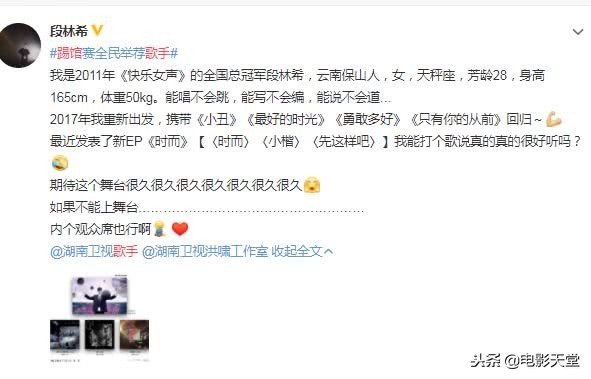 让人意外的是, 曾参加湖南卫视选秀节目《快乐女声》的段林希也报名了,段林希曾获得2011快乐女声总冠军,虽然没什么热度,但能报名,已经很有勇气了。