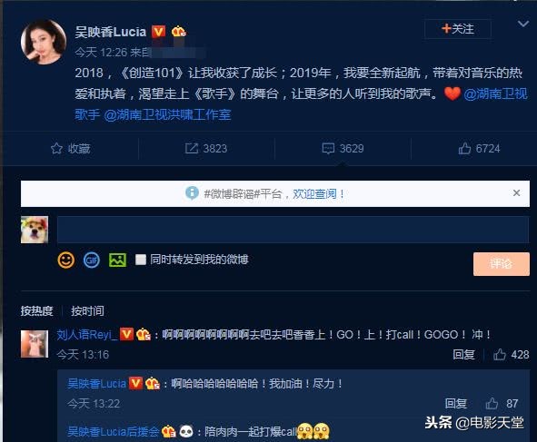 《创造101》选秀节目中也有不少优秀的歌手,虽然未能成功出道,但唱功也是不错的,是节目中的唱歌担当。吴映香也发博要报名,刘人语第一个支持,冲呀。