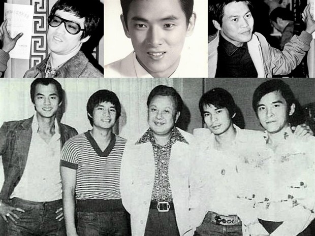 上:李小龙、王羽、罗烈 下:张彻与他的弟子:狄龙、傅声、陈观泰、姜大卫