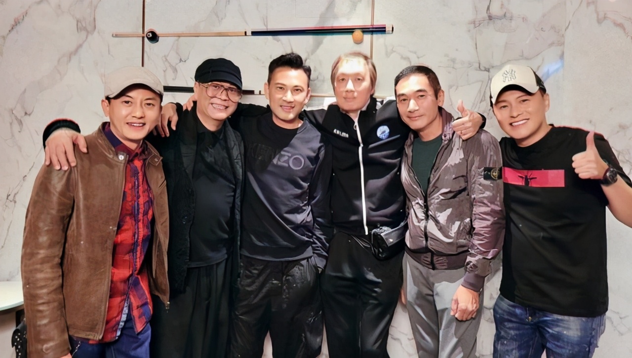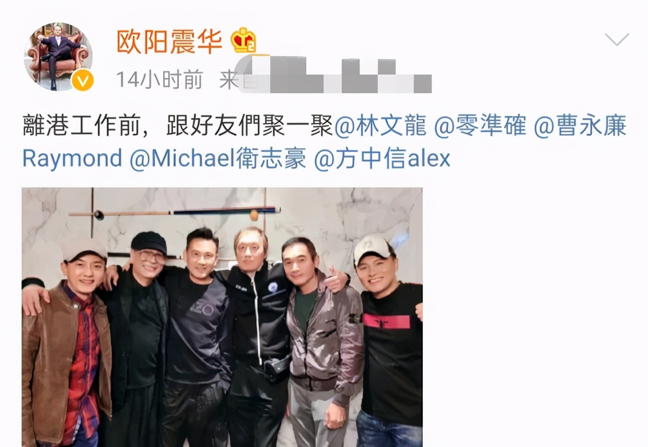 图中的欧阳震华一身黑衣打扮现身,戴着帽子与口罩,脸上还带着他非常经典的笑容,已经59岁的他也发福了不少,挺大肚腩如怀胎一样;而方中信与林文龙几乎没什么变化,还是一如既往的帅气;一旁的曹永廉状态也很是不错。