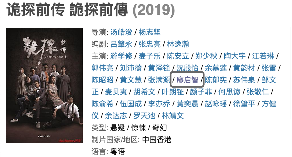 廖启智一生中最后一个角色是《诡探前传》,因为没看过这部剧,所以本能去翻翻剧照,结果大失所望——此时的廖启智,演技绝对当得起tvb或者中国影视圈里的“戏骨”了,但在主演的阵容和剧照当中,竟然找不到他的名字!
