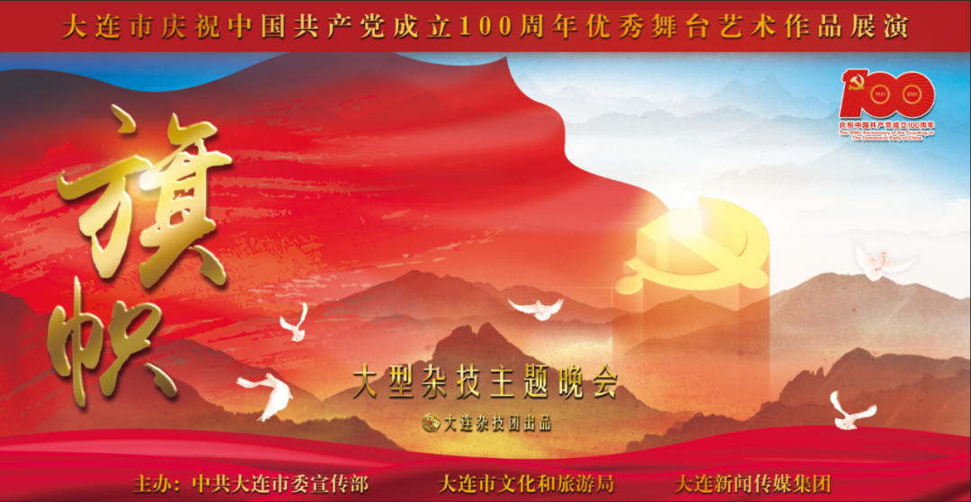 全市庆祝中国共产党成立100周年文艺创作项目、大连杂技团创排的杂技主题晚会《旗帜》以独具魅力的杂技语汇深情述说百年来那些刻骨铭心、具有时代特点的历史瞬间,并辅助以舞蹈、大型魔术等多种表现形式,充分发挥音乐、多媒体、舞美、道具的作用,突出浓厚的民族特色以及强烈的视觉冲击力和震撼的感官渲染力,让观众在欣赏全新的“惊险奇美”舞台艺术晚会的同时,重温中国共产党从建党伊始到新时代的光辉历程和伟大成就。