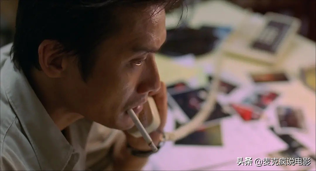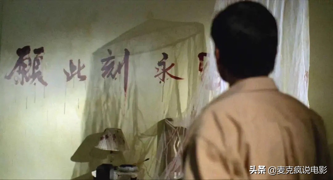 而本片的第二大看点,自然是林岭东以惊悚片的手法来处理一部犯罪题材电影。影片前半段较为侧重对于惊悚气氛的铺垫和描述,譬如诡异的酒店,墙上“愿此刻永留”的五个神秘血字,令人发毛的旧照片等等,都能让观众瞬间代入充满悬疑的氛围当中。