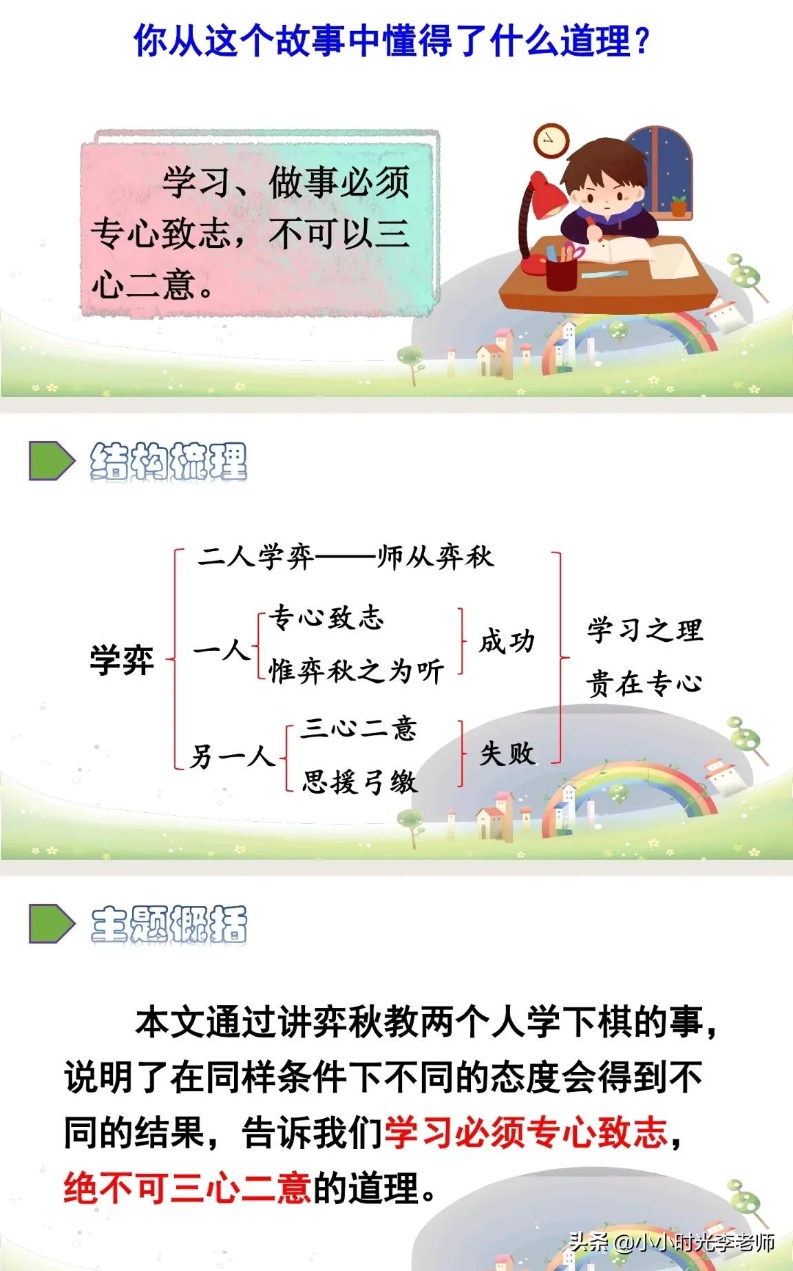 弈秋是全国的下棋高手。让弈秋教导两个学生下棋,其中一个学生非常专心,只听弈秋的教导:一个学生虽然也在听弈秋的教导,心里却一心想着天上有天鹅要飞来想要拉弓搭箭把它射下来。虽然这两个人在一块儿学习,但是后一个同学不如前一个学的好。难道是后一个同学的智商不如别人?回答说:“不是这样的。”