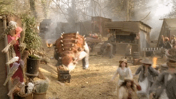 正当哥俩好奇的时候,小镇上突然发生了骚乱,一只巨大的鳞甲生物闯入小镇集市,引发了人群的骚乱,哥俩震惊地发现,这只巨兽居然是史前时代的巨兽——甲龙。