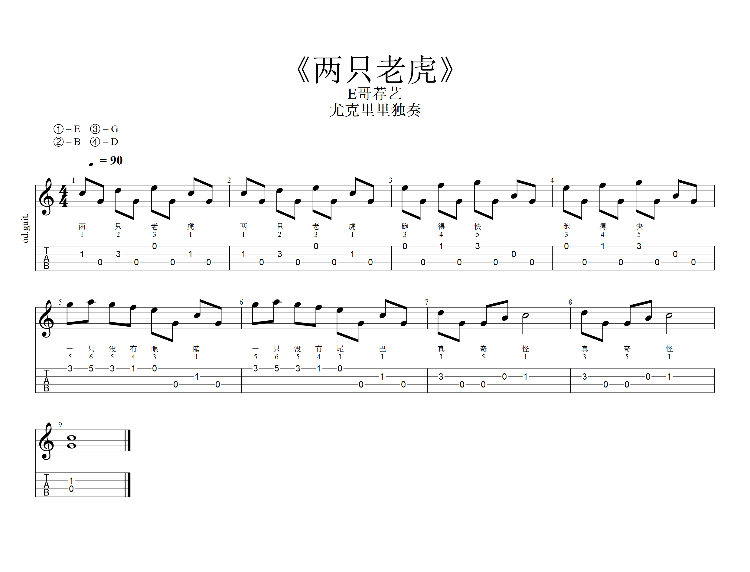 尤克里里的儿童练习曲现在能找到的教材大多都是单音练习曲或者一些弹唱乐谱。相对来说独奏曲谱。特别是简单一点适合儿童练习的有单音伴奏的曲目较少。至少是我查不到的。下面给大家分享一首我加了一些简单单指伴奏并重新打谱的《两只老虎》尤克里里乐谱。希望大家喜欢!
