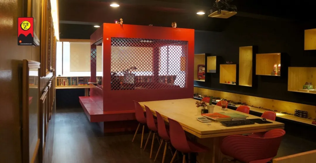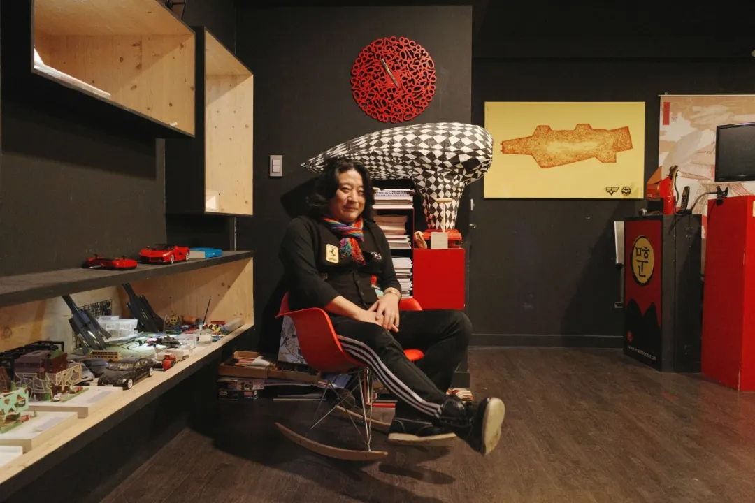 这里大约80平米,藏在首尔江南区一座普通小楼的二层,工作室的大门刷成了鲜艳的“中国红”,门头上还贴着moon叔用工作室名字做成的一道符。红、黑、金三种色调,让这里颇像一个游乐场。