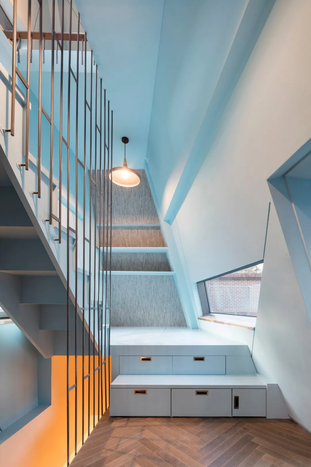 内部的墙面、地板和家具用了温柔的蓝色、灰色和木色,外墙上像刀刻下的锐利线条,转到室内转成了丰富的内饰:沿着它们或者钉上了家具、或者装上了灯管,让每一层窄小的房间变得活泼起来。