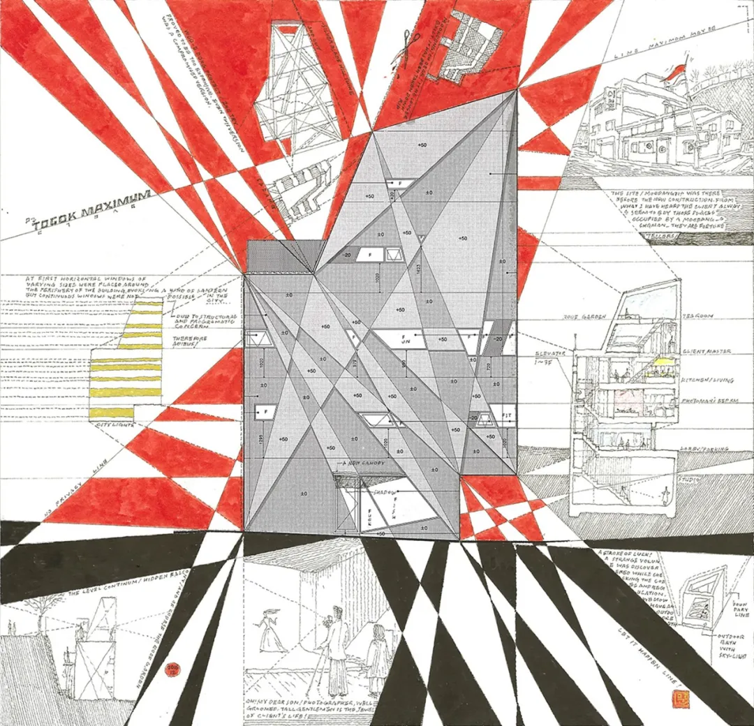 按照建设的限定,moon叔先绘制出房子可以建造的最大极限外轮廓,然后把轮廓上的点点相连,在房子的外立面上得到纵横交错的笔直线条。