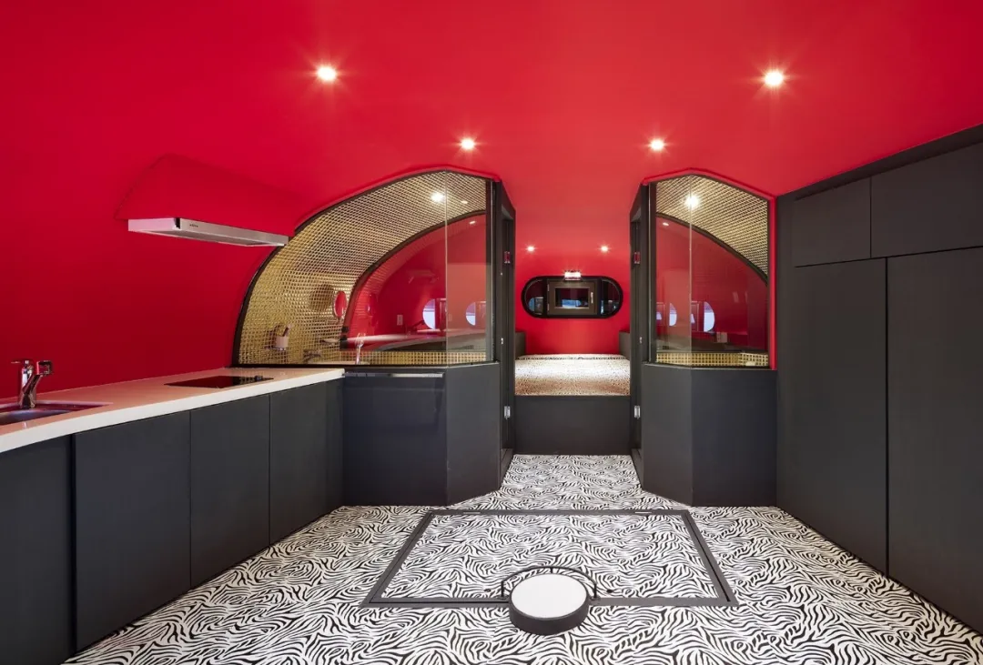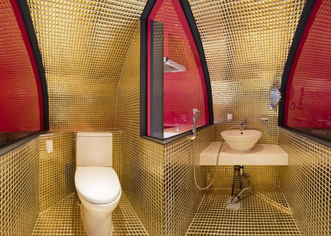 斑马纹的地板、正红色的墙壁、嵌入墙中的黑色家具,厕所和淋浴间贴了闪耀的金色瓷砖。