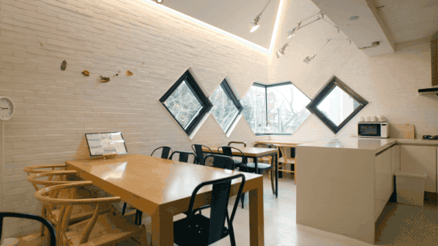 三三两两拼接、或是单个儿存在的菱格形窗子是龙头屋的趣味之处:“预算有限,窗户都是1米x1米的尺寸,如果一溜儿平铺过去,未免太普通。