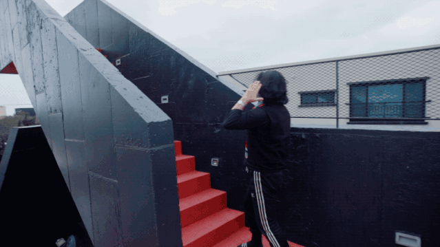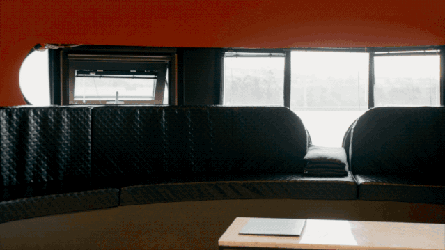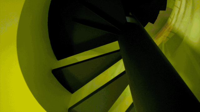 进入“太空鸭’的过程非常奇幻,地面的入口藏在两个方盒子房间的中央,通过旋转楼梯一直爬到顶,大力向上推开一块厚重的木板,这便进入了“太空鸭”的内部: