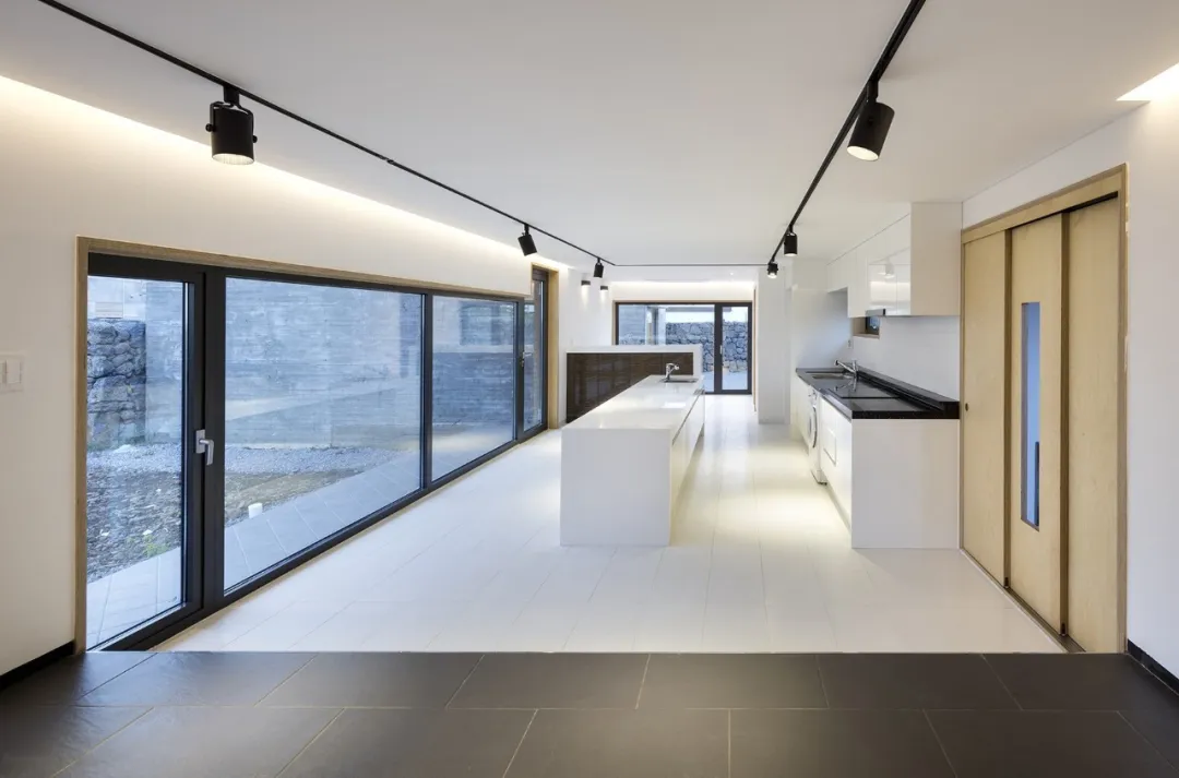 他用济州岛上自产的暗棕色玄武岩围合起一个小院子,院子中央是小房子,约150个平方的主体分成三个部分: