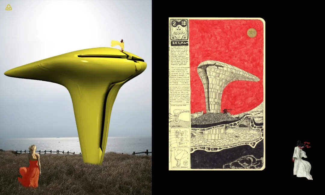 “这个老人找到我,说想在济州岛上建一个风的博物馆。济州岛就是个以刮大风出名的地方,我爱极了从风出发造房子的概念,于是勾出了一个女人的头发吹在风中的造型。结果没想到,他的生意没做好,断了资金,博物馆的设计也搁置了。”