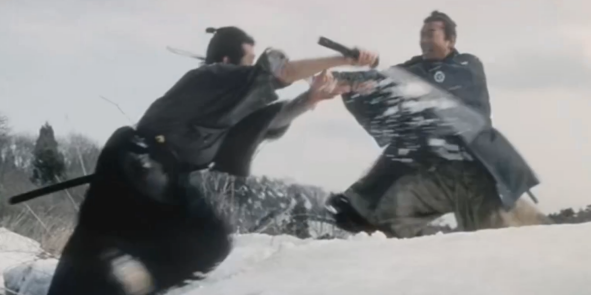 当然,日本的剑戟片请的动作指导一般都是知名的道场师范,打斗戏比较偏写实,其中确实有不少比较真实的细节。尤其是早期的日本剑戟片,可以看出动作指导确实有真实打斗的战斗经验,很多细节并不是没有战斗经验的人能想象出来的。比如日本1969年上映的剑戟片《御用金》中,最终雪地对决的一场戏里,武士为了保证手部灵活,专门拿火把烤手前去决斗。这种细节足以说明动作指导是真的有在冬天室外对抗的经验的,手被冻僵的话显然会对出手速度产生很大的影响。同样如果戴厚手套,一样会对挥刀产生影响。所以最大程度保证手部灵活性的细节,尤为真实。