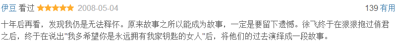 哪怕这么多年过去了,依然会为徐飞(古天乐饰)和武俏君(宣萱饰)俩人的虐恋感到遗憾,对“前任”这个可怕的存在耿耿于怀。