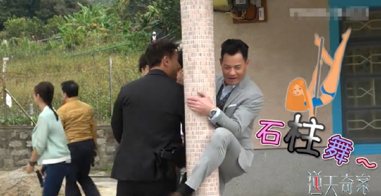 拍摄完一场紧张的追逐戏后,黄智贤一会儿举着酷似令牌的道具自封教主,一会儿又吐槽陈展鹏拍戏找掩护体就像在跳石柱舞,自娱自乐超开心。