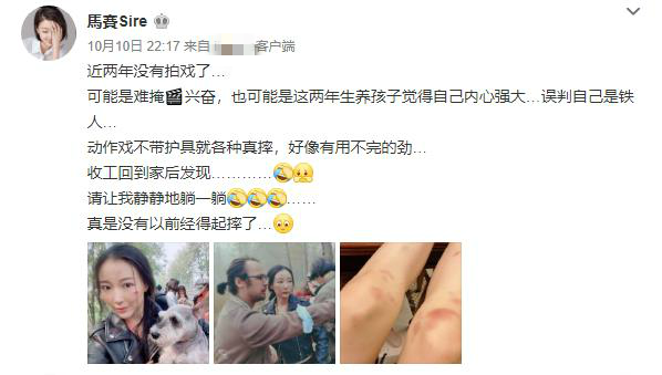 近期,马赛频频在社交平台"营业",时常晒出日常生活的片段,以及分享养生、保养知识。也可在账号中看到,马赛并未放弃演员工作,在10月时还发文晒出拍戏受伤、膝盖淤青的照片。