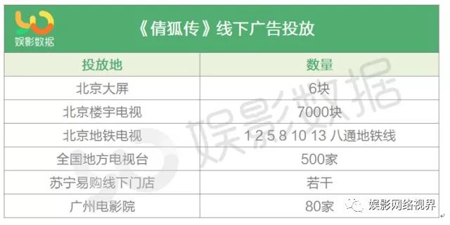 影片在地铁站、户外大屏投放广告,还重点在楼宇电视、地方电视台以及电影院进行了投放,线下宣传推广全面铺开。具体统计如下:
